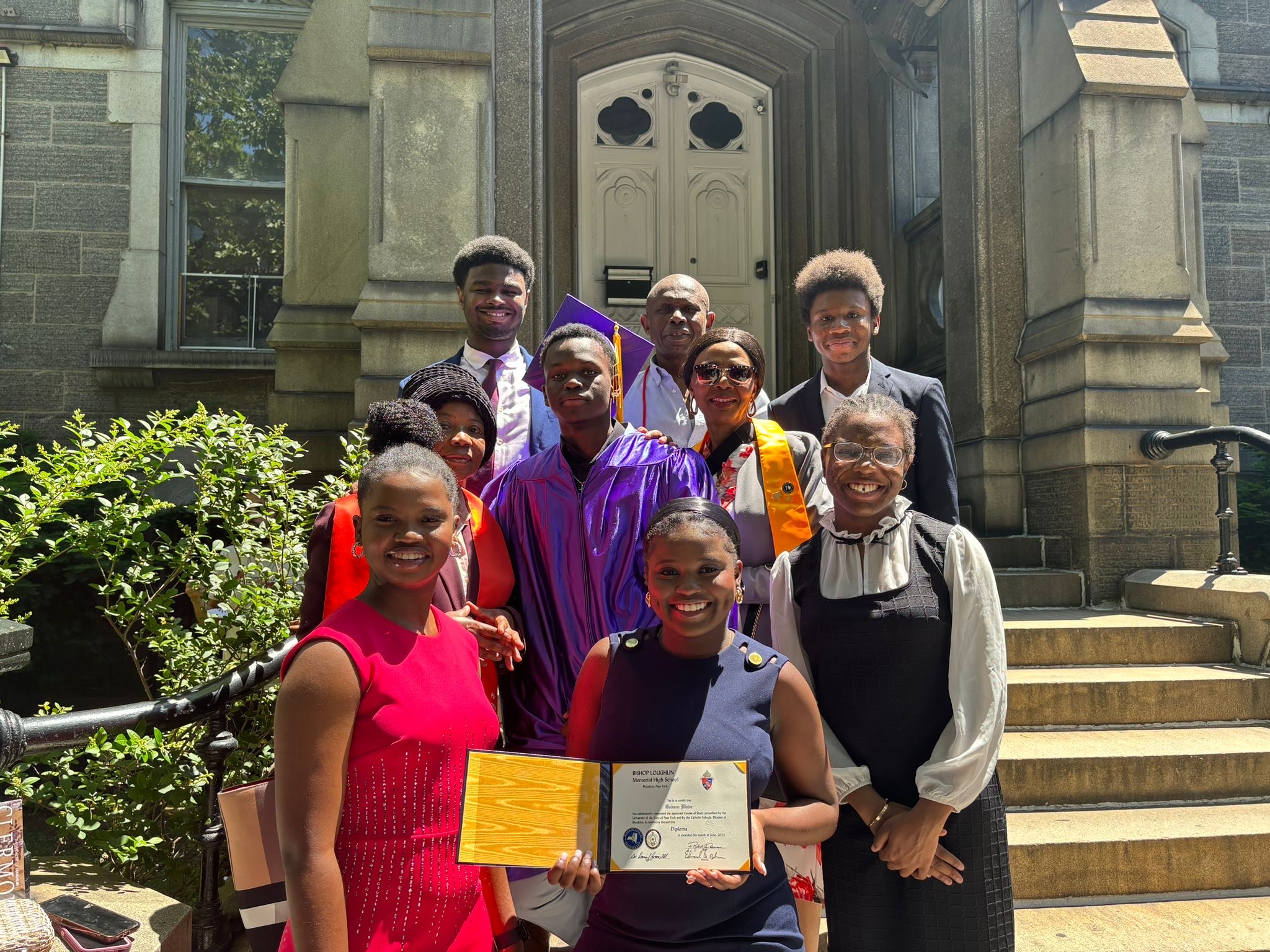 Sophonie (front), and Godson (middle, wearing gown) with their family during a Hope Ignites New York graduation celebration.